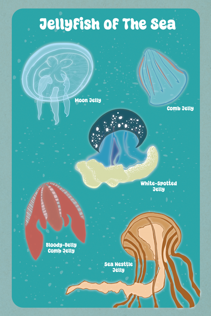 A series of five jellyfish drawings, each showcasing a unique species with intricate details. Each piece highlights the graceful movement and delicate structures that make these creatures so captivating.