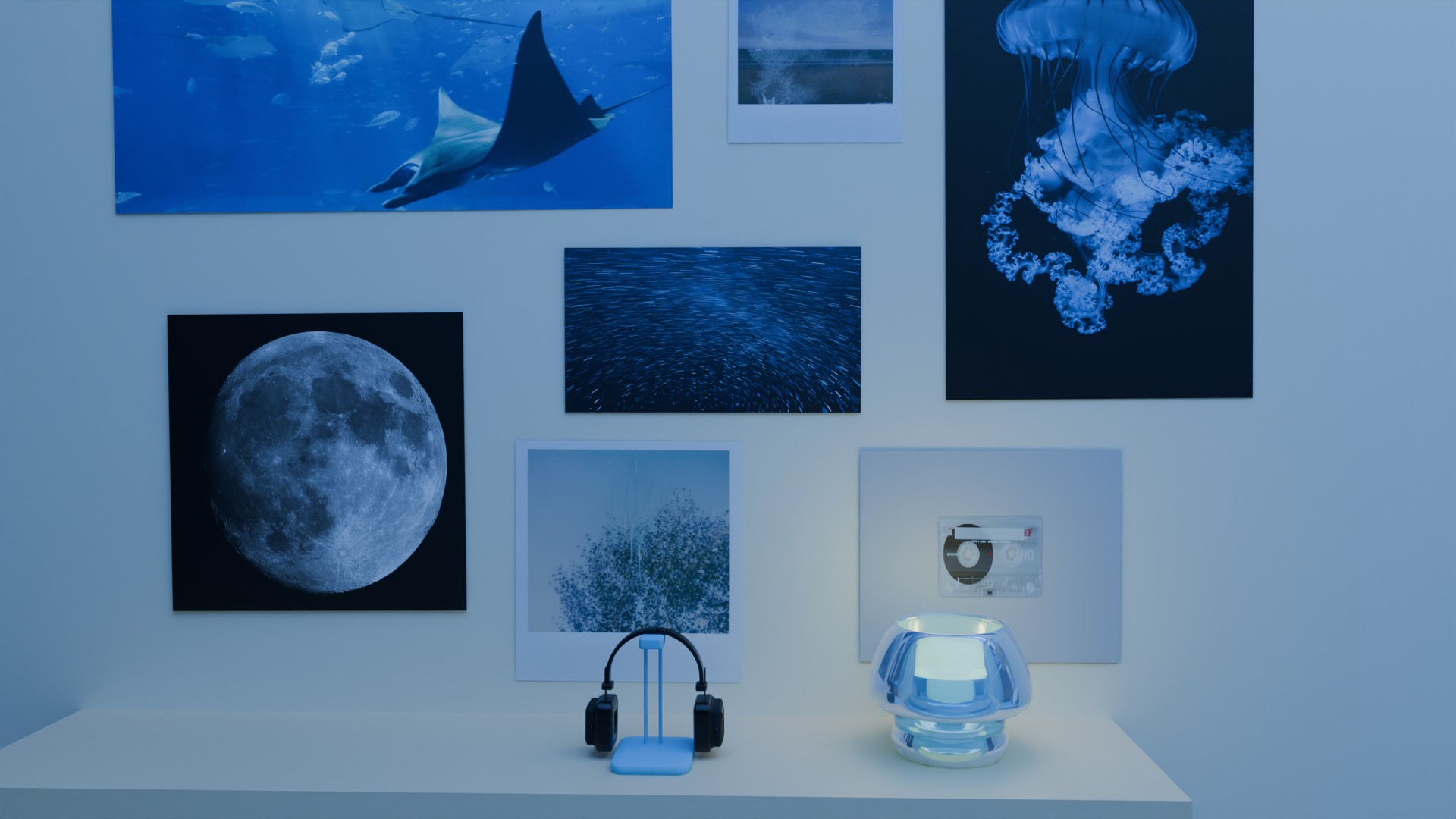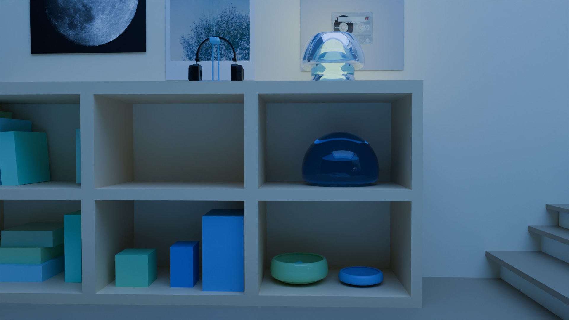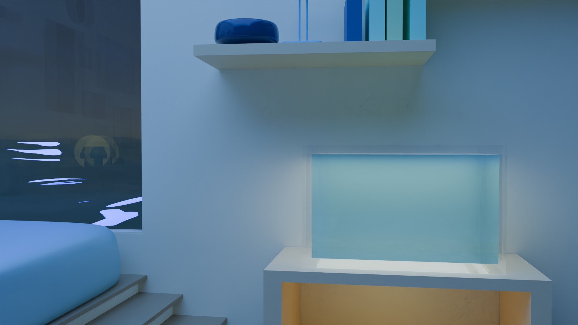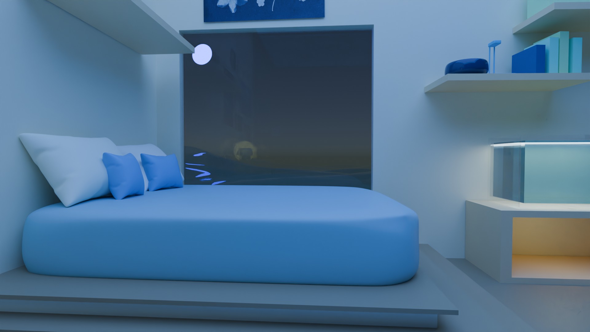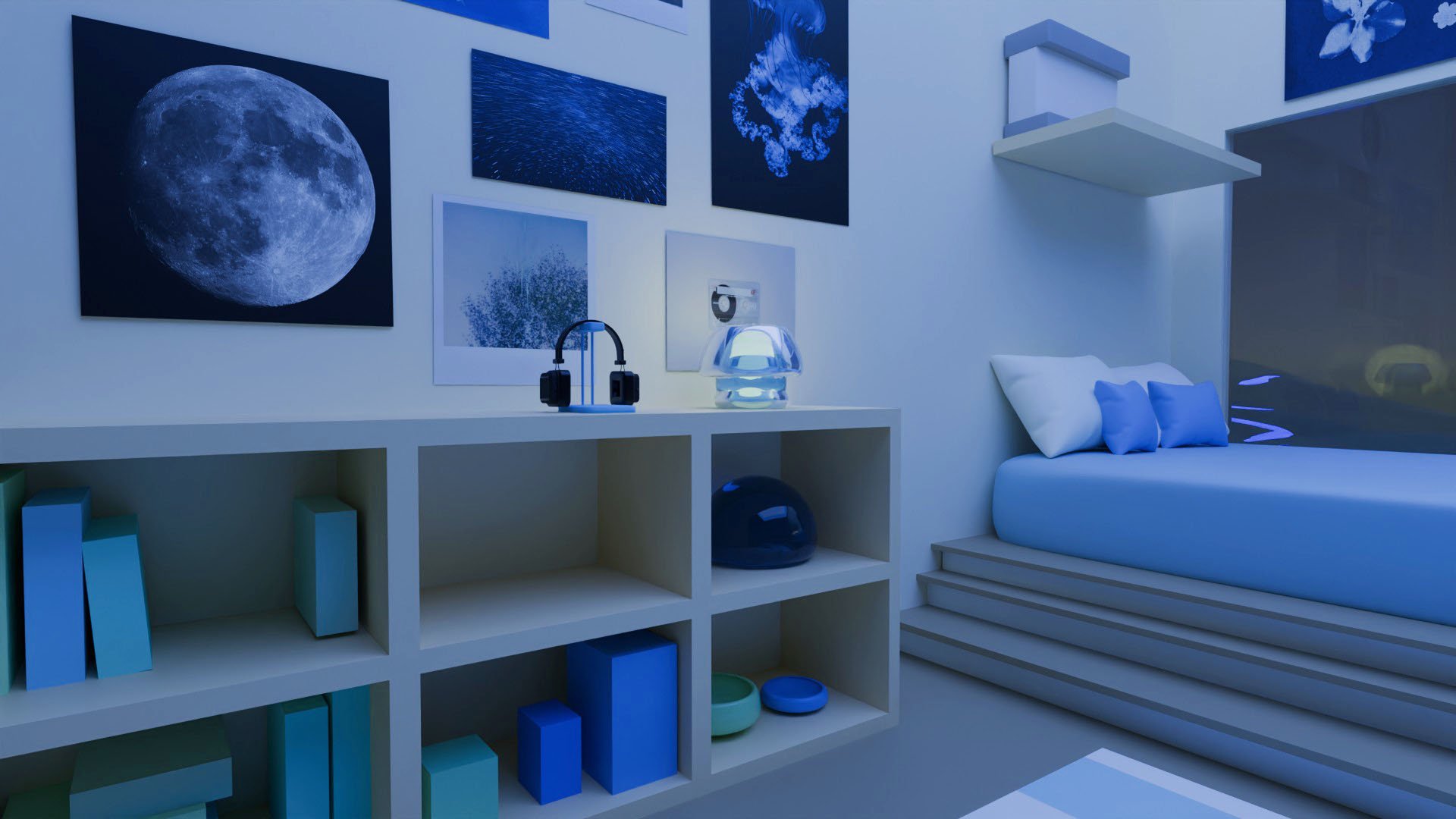 A 3D render of my dream room created for a low poly project, featuring a monochromatic blue room. The design focuses on clean, geometric shapes and subtle shading, all within a minimalist, blue-toned aesthetic.