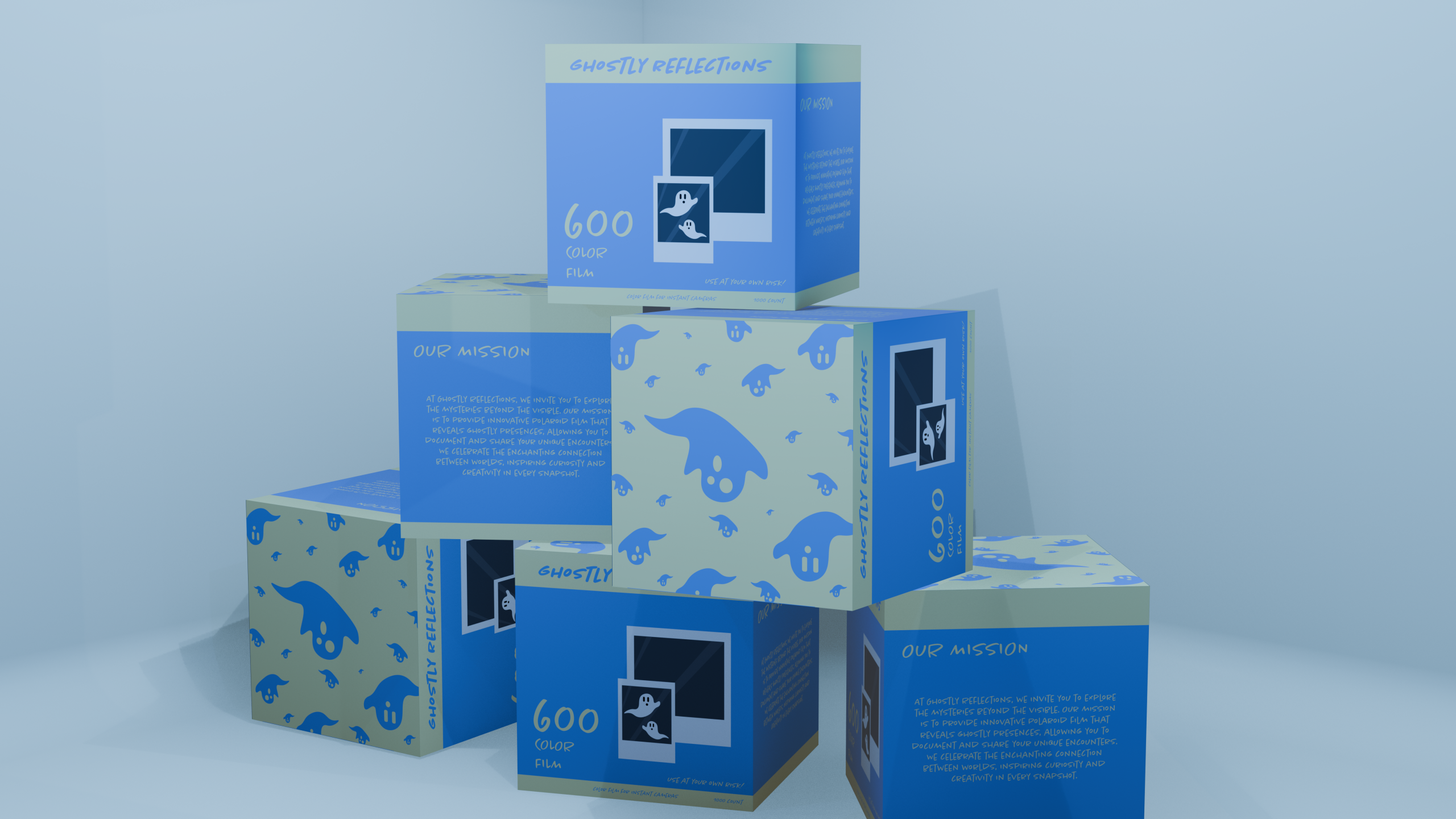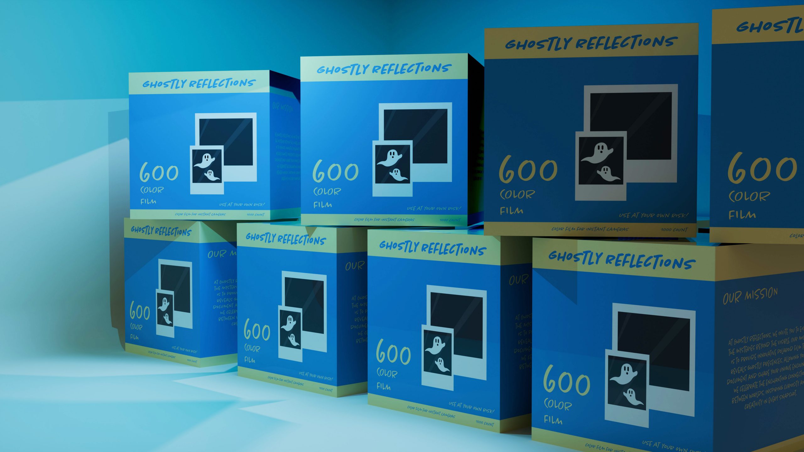A 3D render of the ‘Ghostly Reflections’ product box, featuring a minimal design that highlights the concept of capturing ghosts on Polaroid film. The clean, simple packaging uses subtle details to evoke a mysterious vibe.