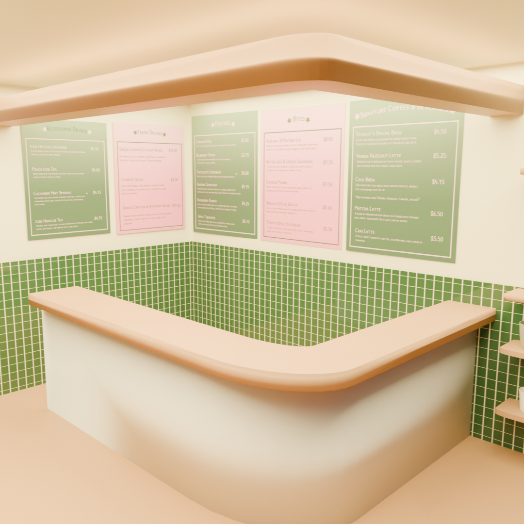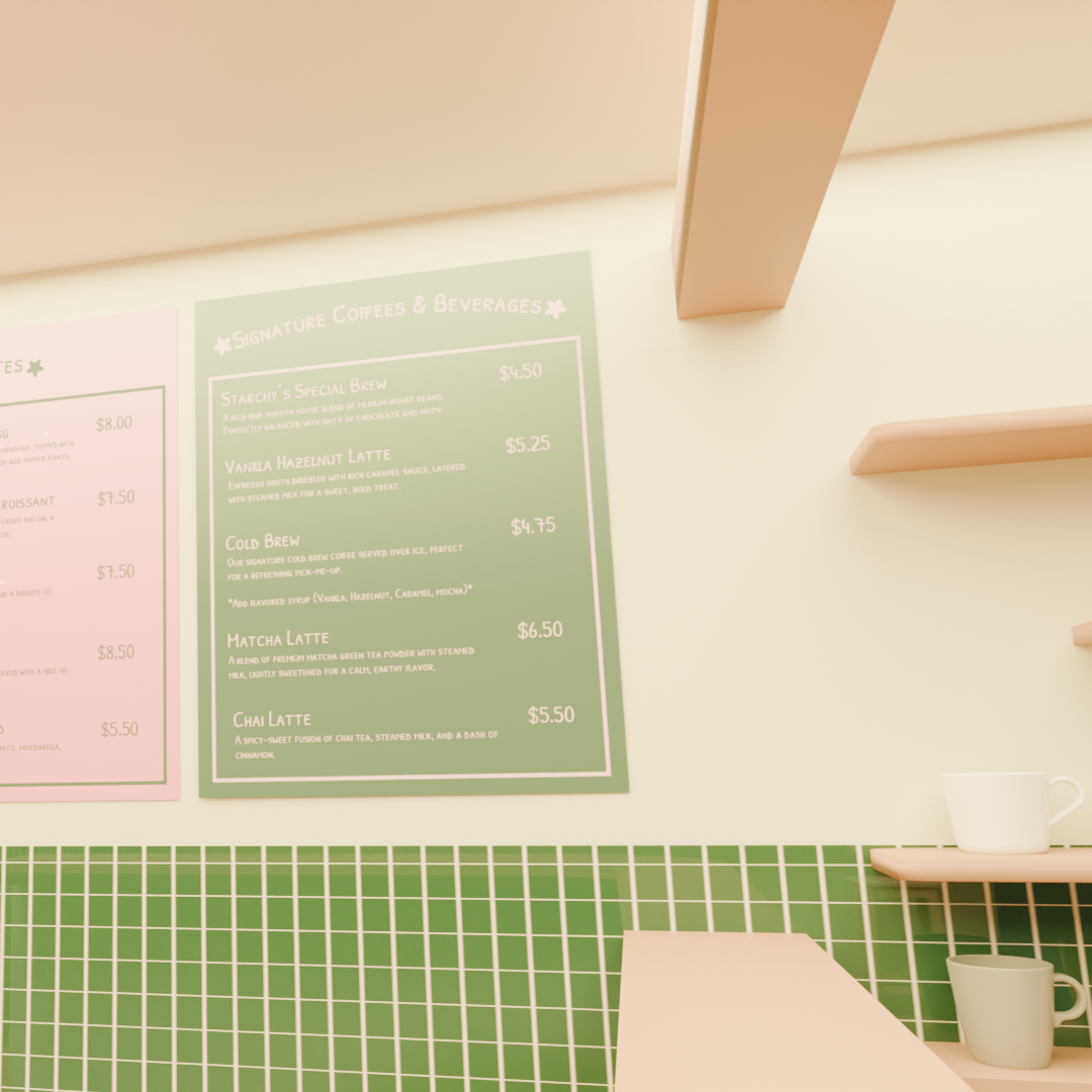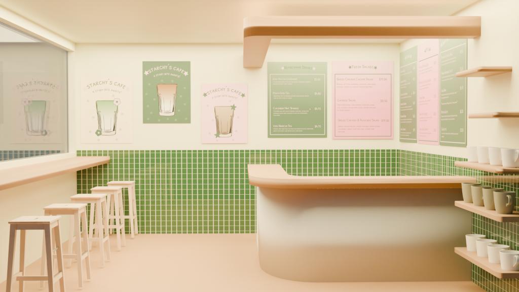 A 3D render made for a fake cafe website, designed to bring the concept to life visually. The scene captures the atmosphere with detailed interior elements, lighting, and a cozy, inviting layout, creating a realistic yet imagined space.